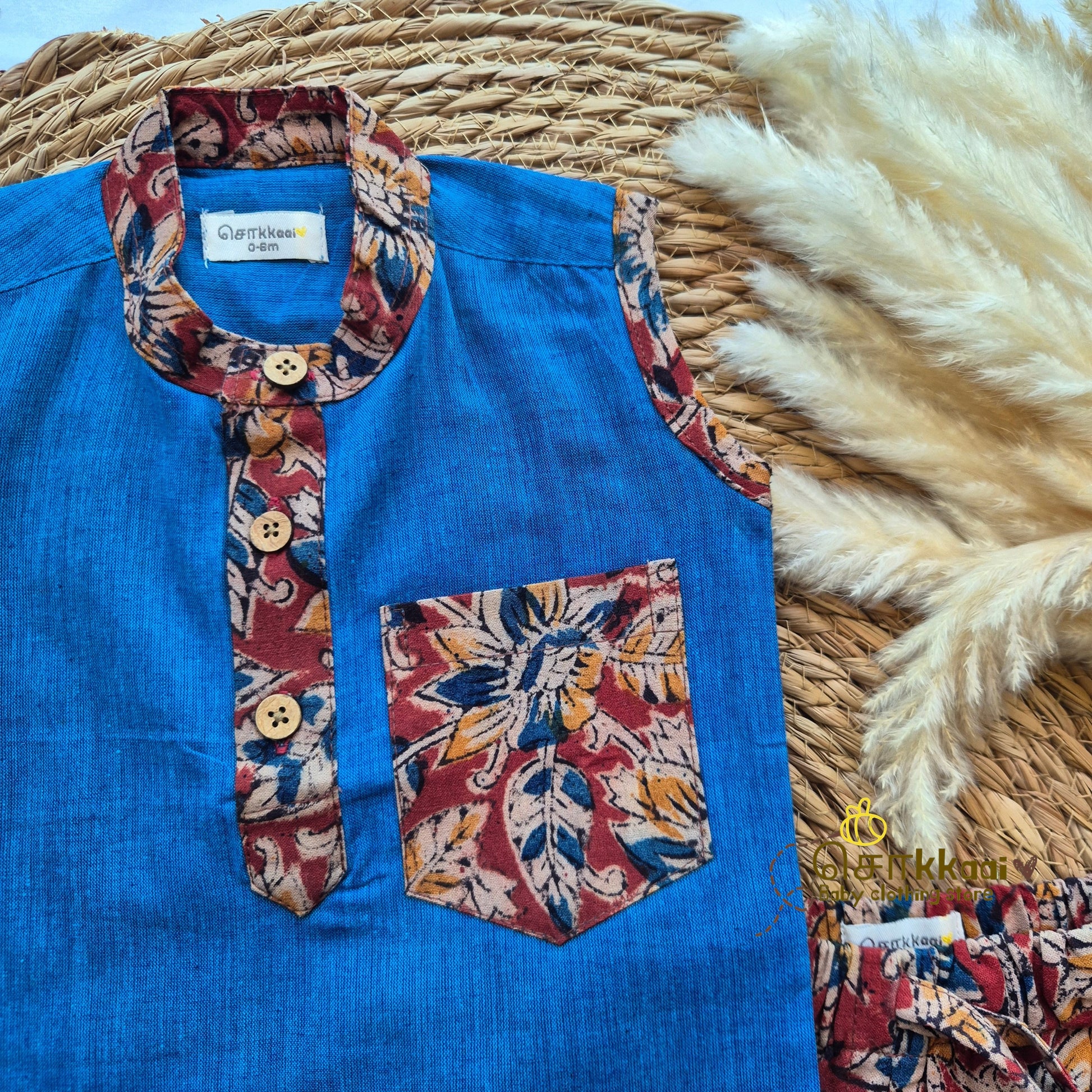 Bright Blue with Rapid Kalamkari Cotton Dhoti Set (0-3yrs) - Sokkaai