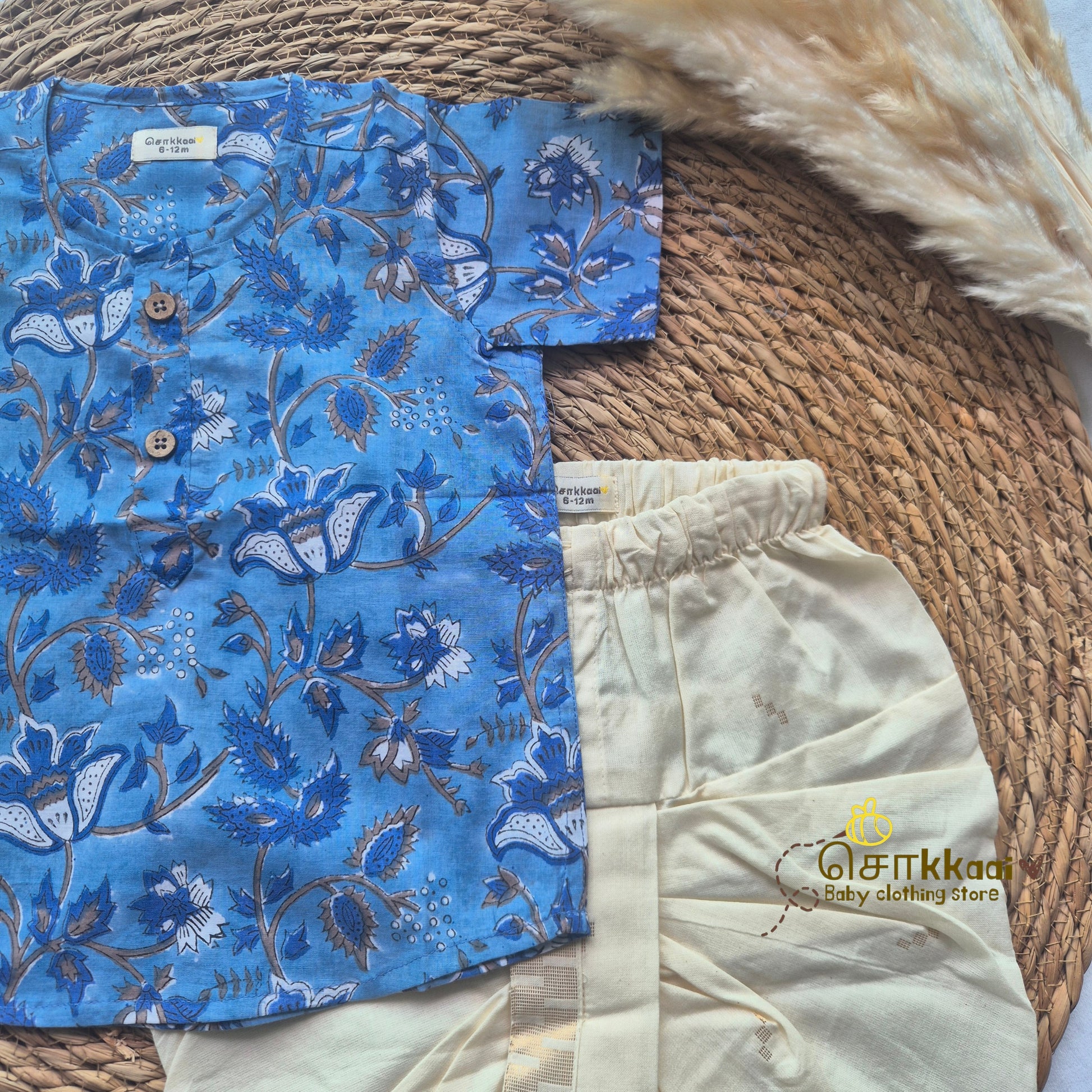 Denim blue floral block Cotton Kids dhoti set (6m-5yrs) - Sokkaai