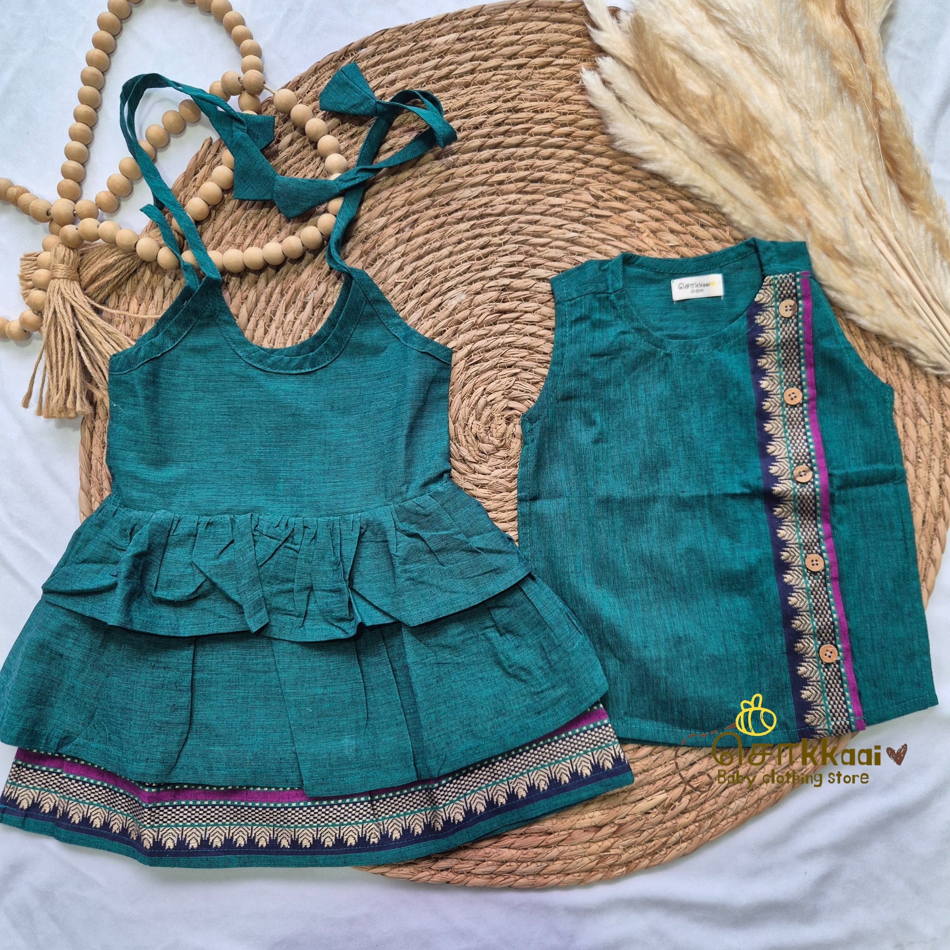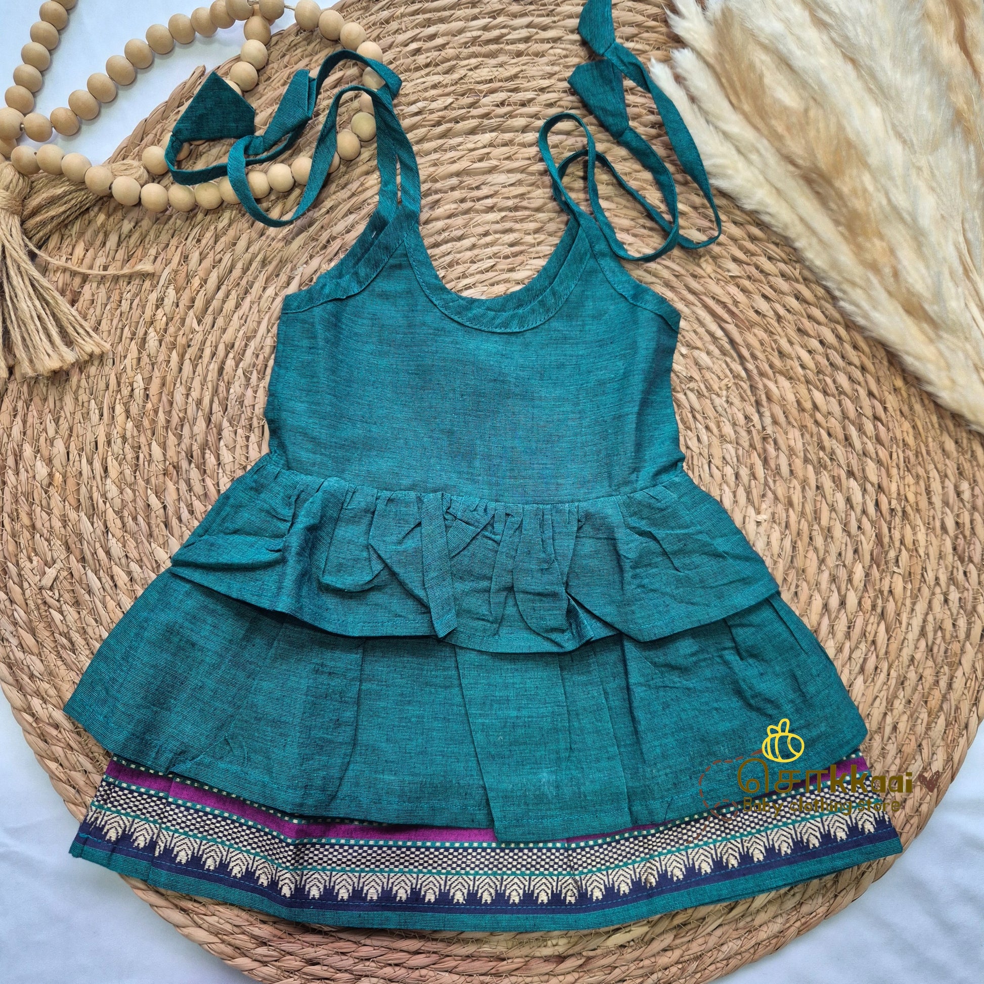 Emerald green with navy Tassel tie frock - (0-3years) Sokkaai