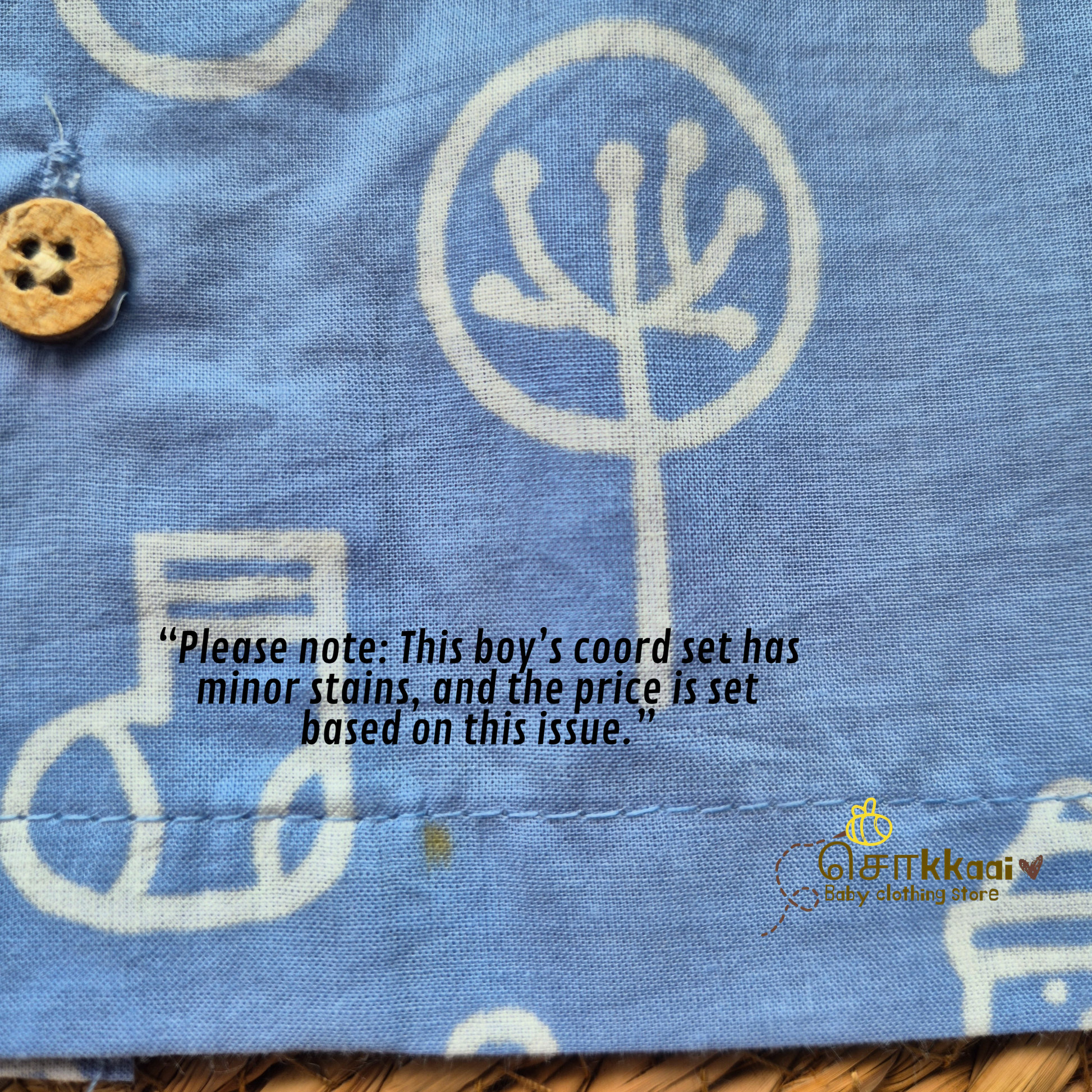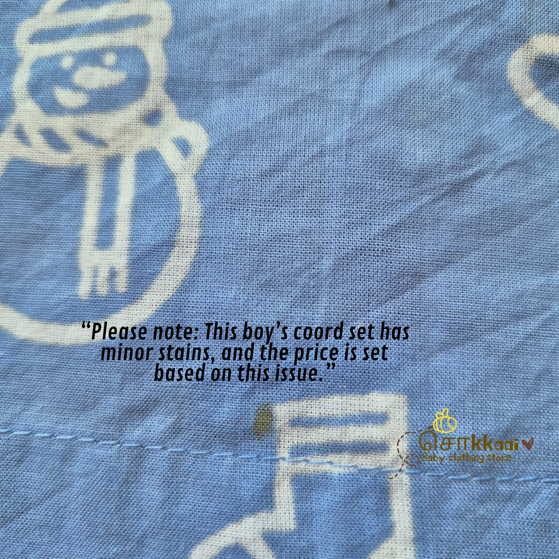 “Please note: This boy’s coord set has minor stains, and the price is set based on this issue.”