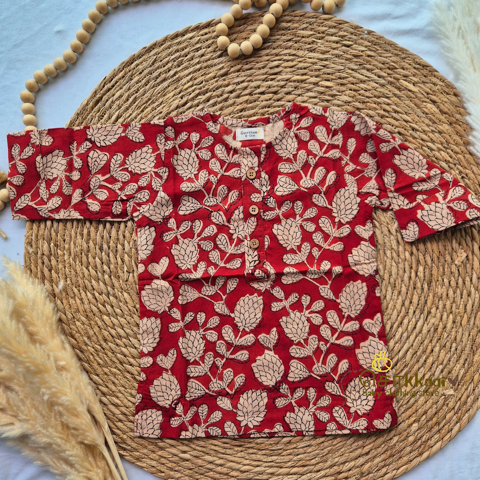 Red hand block Mid length kurta with elbow sleeve (6m-6years) Sokkaai
